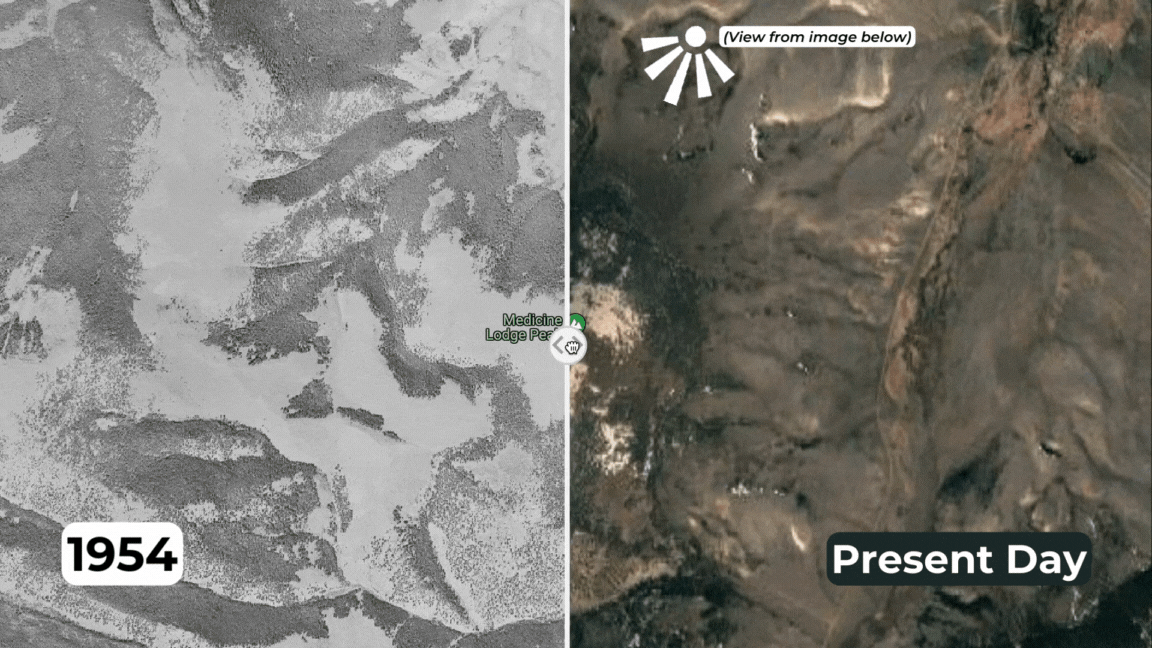 Historic aerial imagery showing conifer infill and expansion from 1954 to present day on the slopes of Medicine Lodge Peak in Beaverhead County, southwest Montana. Conifer infill is evident in the increased darkness of tree-dominated areas, while conifer expansion has occurred especially north of the peak as woodlands slowly expand into sagebrush rangelands at lower elevation. This boundary was historically mediated by frequent low-intensity wildfires. Imagery courtesy of Working Lands for Wildlife’s Landscape Explorer.